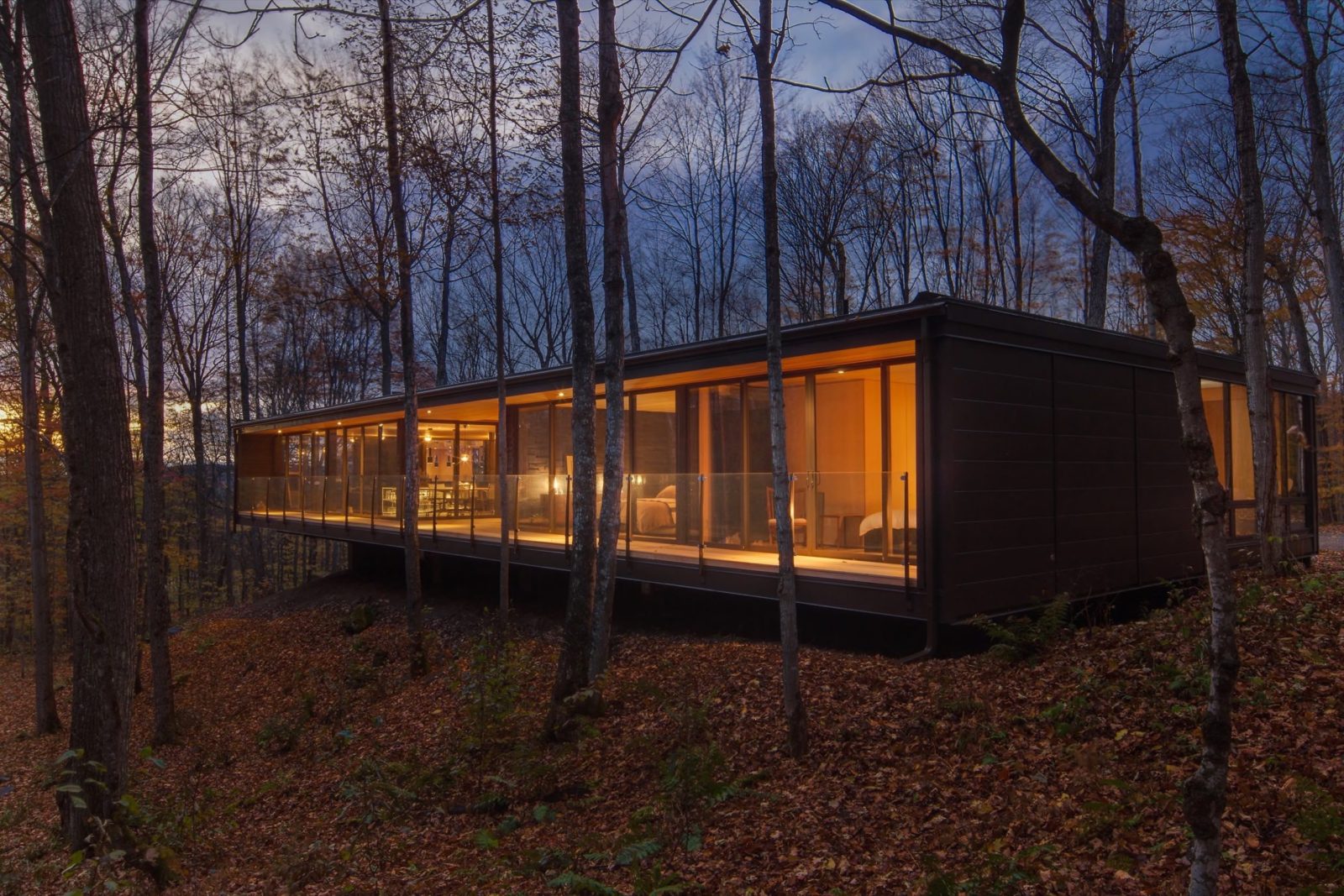 Built as a home/studio for MAFCOhouse founders, Diane and Dan Molenaar, Moose has a fully glazed 84′ south elevation. The entrance nook and end bays are cantilevered 7′ beyond the foundation and the south elevation 11′, pushing the engineering envelope and making the building appear to float above grade.